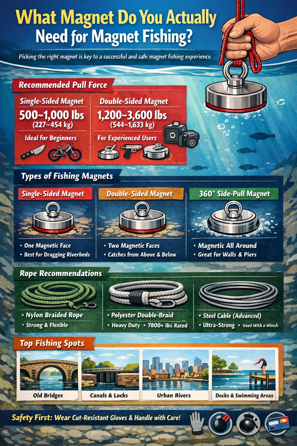Một cảnh báo quan trọng: lớn hơn không phải lúc nào cũng tốt hơn. Nam châm cực mạnh - bất cứ thứ gì trên 2.000 lbs - có thể làm đứt dây thừng, gần như không thể tách khỏi bề mặt thép nếu không có dụng cụ nêm và gây ra rủi ro chấn thương thực sự nếu chúng kẹp ngón tay. Những người câu cá nam châm mới nhảy thẳng tới một nam châm 3.000 lb thường thất vọng hoặc bị tổn thương. Xây dựng dần dần.