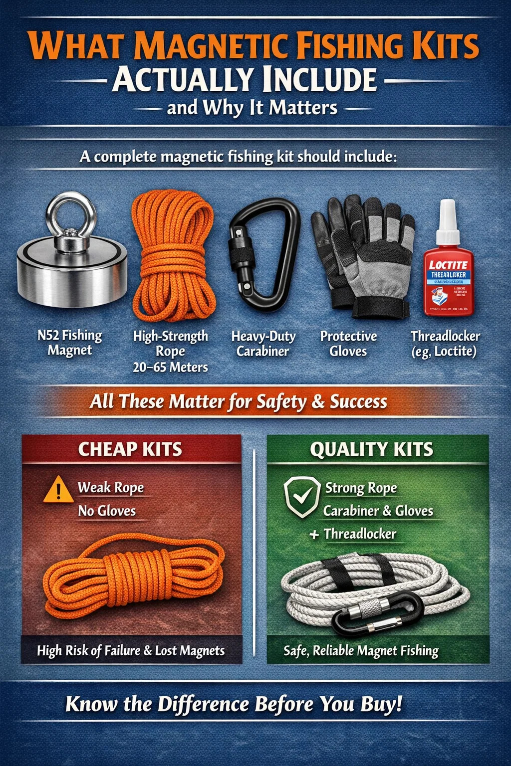 Bộ dụng cụ bình dân thường bao gồm một nam châm một mặt 60–75mm với lực kéo được công bố là 200–300 lb, một sợi dây dài 20 mét có chất lượng thay đổi và một móc carabiner nhỏ. cácse kits are suitable for children, beginners testing the hobby, and shallow-water fishing where you're mostly recovering small items like coins, bolts, and knife blades. Các nam châm trong dòng sản phẩm này có chức năng nhưng thường sử dụng neodymium cấp thấp hơn một chút với chất lượng lớp phủ không nhất quán — có thể sẽ xuất hiện một số vết rỉ sét trên bề mặt sau 6–12 tháng sử dụng thường xuyên.