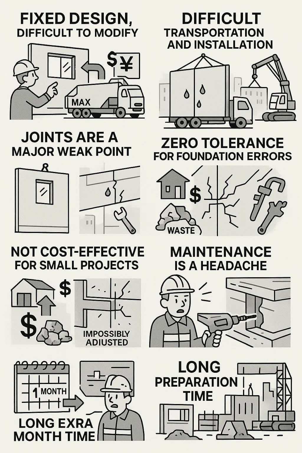 Dưới đây là một số nhược điểm chung của bê tông đúc sẵn trong ứng dụng thực tế: