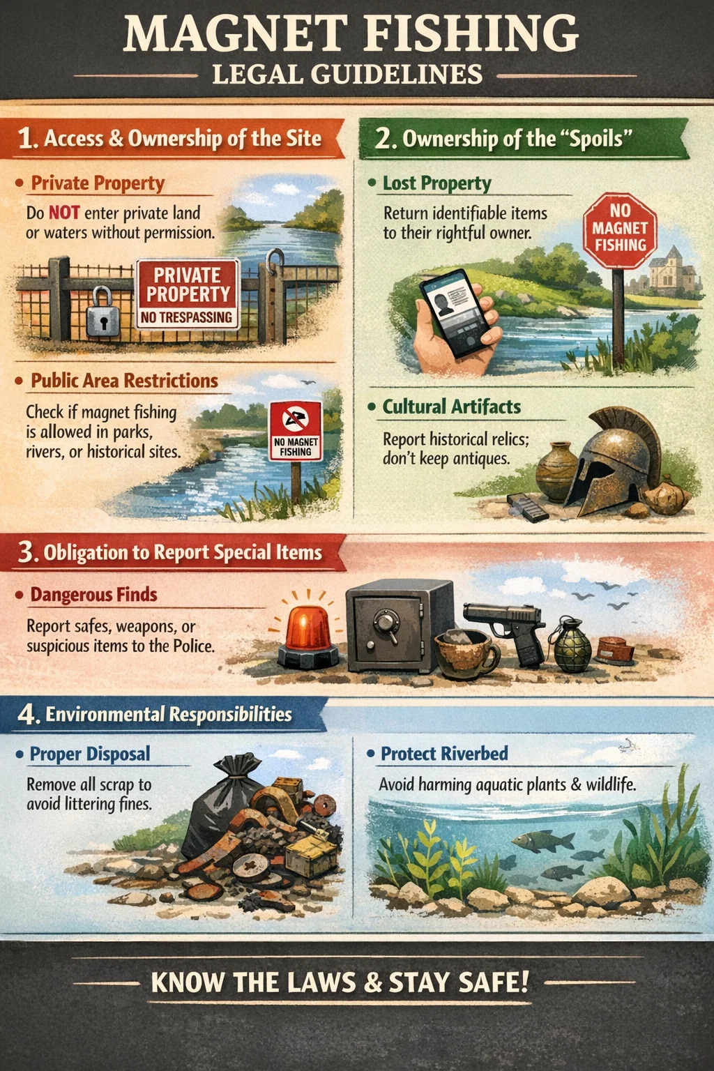 Trước khi tham gia câu cá bằng nam châm, điều quan trọng là phải hiểu các luật và quy định có liên quan. Mặc dù hoạt động này được coi là một cách tích cực để làm sạch môi trường ở nhiều nơi nhưng về mặt pháp lý, nó liên quan đến nhiều khía cạnh khác nhau như quyền đất đai, quyền sở hữu các vật phẩm được thu hồi và an toàn công cộng.