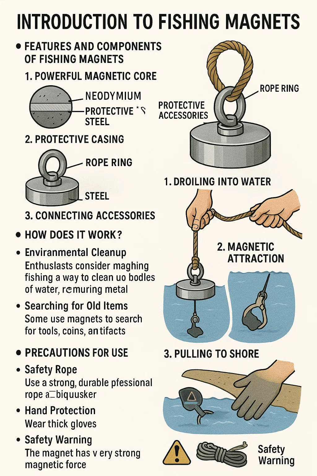 Nam châm câu cá, đúng như tên gọi, là một công cụ từ tính cực mạnh dùng để "câu" các vật thể bằng sắt ở đáy nước hoặc ở những nơi khó tiếp cận. Nó sử dụng lực từ mạnh để hút và lấy các vật kim loại, thay thế cho các loại móc và dây truyền thống.