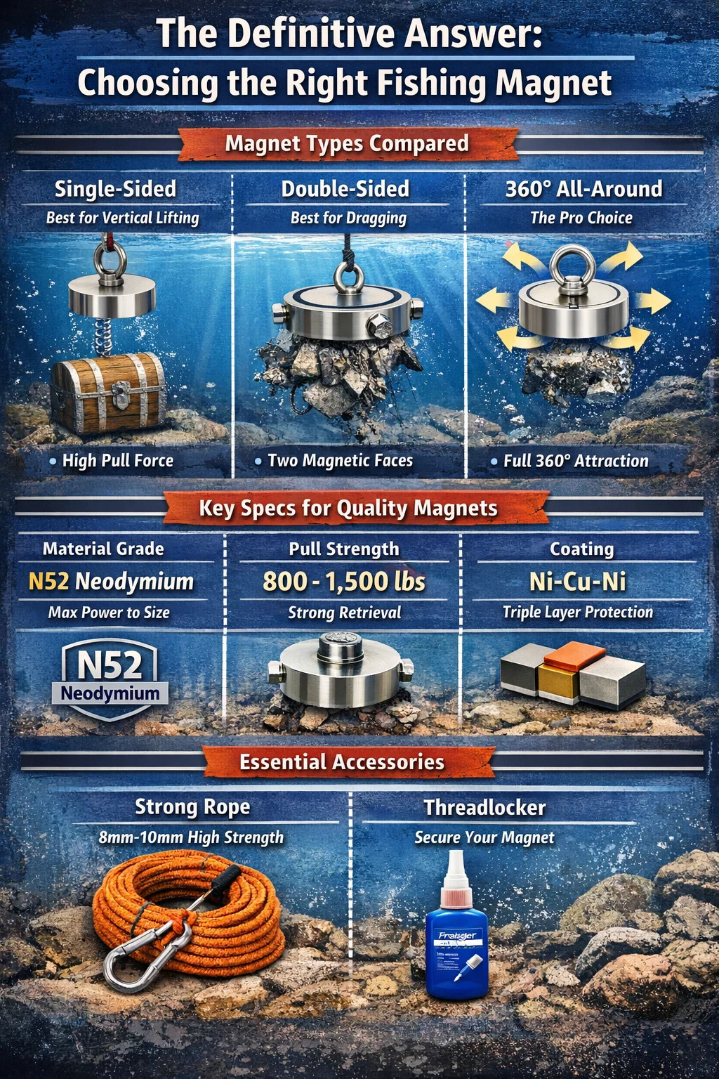 Nếu bạn mới bắt đầu, hãy thử một nam châm câu cá hai mặt kit với mức độ kéo khoảng 1.200 lbs (kết hợp) . Điều này mang lại cho bạn lực khoảng 600 lbs mỗi bên, đủ để kéo xe đạp và dụng cụ lên mà không nặng đến mức trở thành việc vặt khi ném. Đối với những người đang tìm cách tối đa hóa những phát hiện của họ trong lớp bùn sâu, Quái vật 360 độ là vị vua không thể tranh cãi của lòng sông.